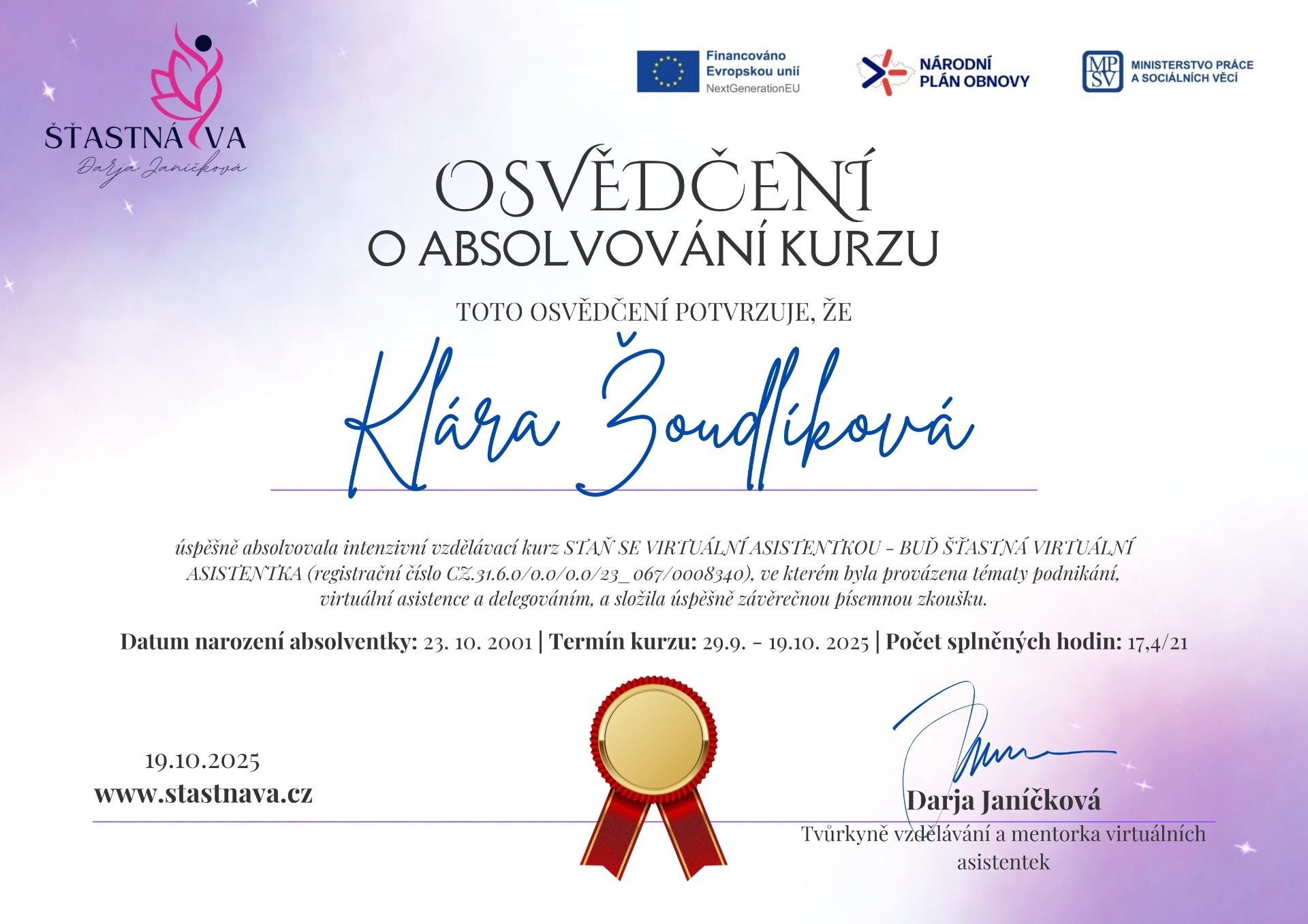 Stojím nohama pevně na zemi, ale hlavou už se dívám dopředu. Kromě každodenní podpory klientů se momentálně věnuji i vlastnímu rozvoji a jednomu pro mě zásadnímu projektu. Je to projekt, který mi dovoluje růst v oblastech, které mě fascinují, a dává mé práci úplně nový rozměr. Zatím si detaily nechávám pro sebe, protože cítím, že tento záměr potřebuje svůj čas a prostor k dozrání. Je to pro mě ale jasný důkaz, že hranice mých možností se neustále posouvají. Dnes už vím, že moje značka není jen o administrativě, ale o neustálém hledání lepších cest, jak podpořit vaše podnikání. Právě ta energie, kterou vkládám do svého rozvoje, je tím, co pak přenáším do každého vašeho úkolu.